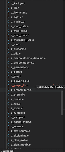 Towards the bottom of the code folder, we can find a few files that relate to the player: z_player_call.c and z_player_lib.c. Let’s open both and see if we can find anything that we can immediately understand/infer is related to our understanding of how we play as Link.